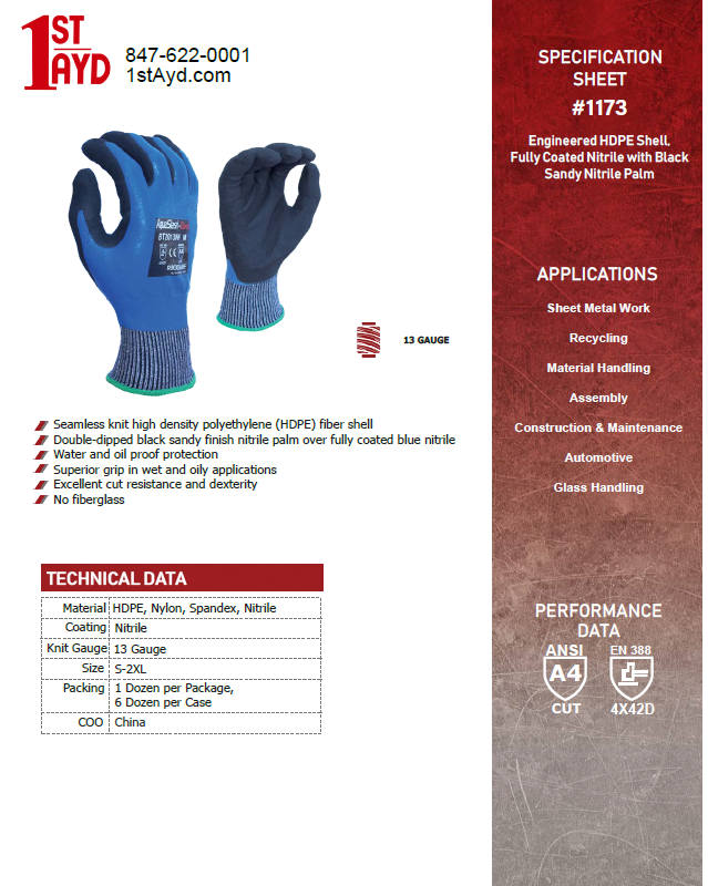 Sizes M-XL; Cutman A4 Blue Work Gloves 13 gauge, Knit w/ dbl nitrile palm