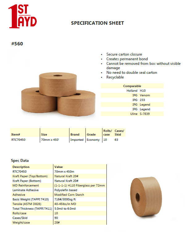 Non-asphaltic tape. Laminated tape for shipping all types of boxes. Reinforced for extra strength. Water activated - must be moistened in tape machine.