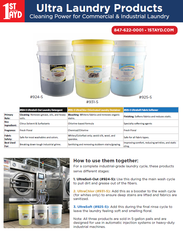 #931-5: UltraChlor Chlorinated Laundry Destainer: A powerful chlorine additive for institutional laundry and industrial cleaning and deodorizing. Eliminates stains and brightens white and colorfast cottons, linens, and other fabrics. Rapidly penetrates and removes a variety of organic and inorganic soils. No for use on silk, wool, mohair, leather, spandex (lycra), or non-colorfast fabrics. Also an excellent cleaner and deodorizer for food plants and other industrial applications.